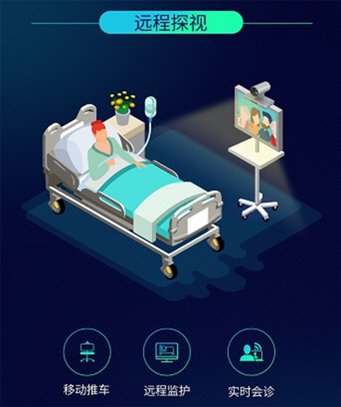 重癥監(jiān)護(hù)病人或者特殊病人的探視,可以通過(guò)結(jié)合醫(yī)療移動(dòng)推車實(shí)現(xiàn)家屬、病床、護(hù)士站之間的實(shí)現(xiàn)無(wú)接觸的探視需求。醫(yī)護(hù)人員通過(guò)系統(tǒng)可以同時(shí)監(jiān)護(hù)多個(gè)重癥監(jiān)護(hù)室,解決醫(yī)護(hù)資源短缺問題。