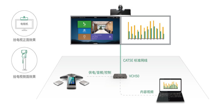 只需一根超五類標準網(wǎng)線即可連接電視區(qū)會議桌,現(xiàn)有普通會議室輕松升級為視頻會議室,易部署