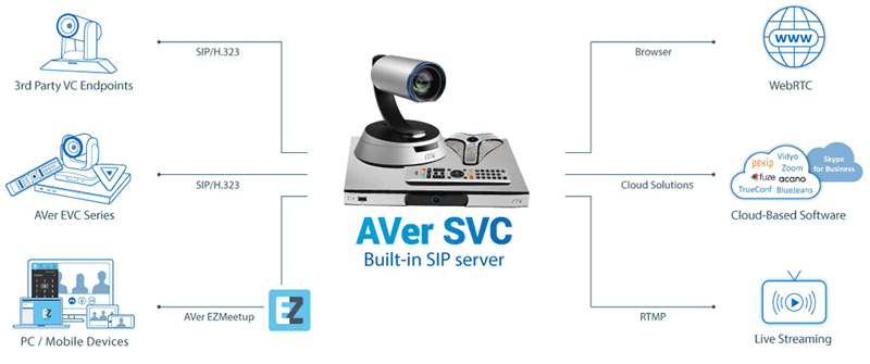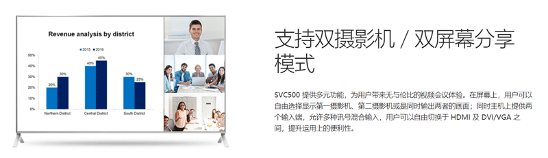 SVC500 可以接收和分享實(shí)時(shí)影像或是簡報(bào)檔案等內(nèi)容。除了和 Skype for Business 完美結(jié)合外,同時(shí)也支持 H.323 和 SIP 兩種通訊傳輸協(xié)議,大幅增加系統(tǒng)兼容性,為協(xié)同合作帶來更多可能。