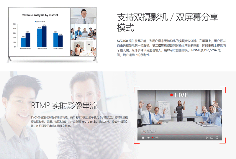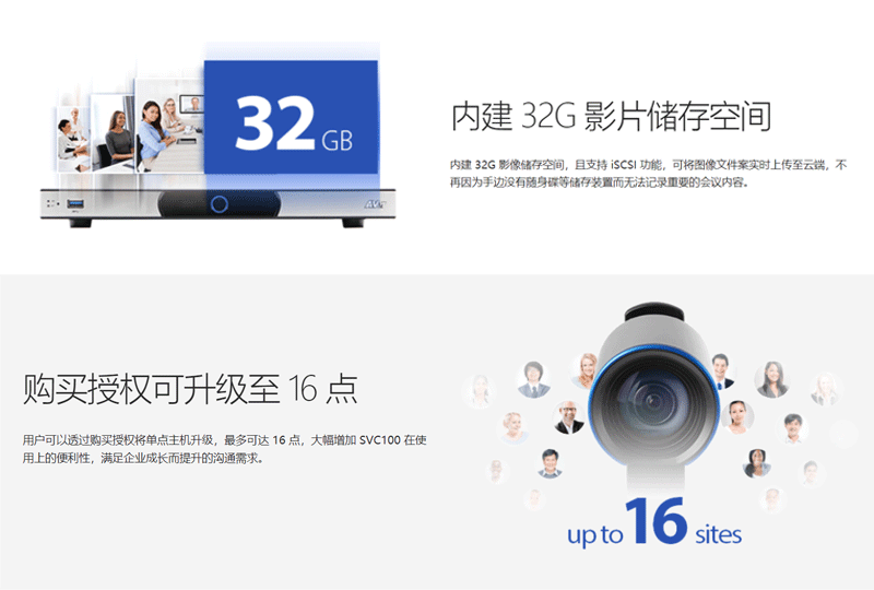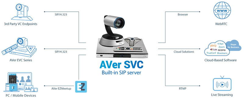 SVC100 可以接收和分享實時影像或是簡報檔案等內(nèi)容。除了和 Skype for Business 完美結(jié)合外,同時也支持 H.323 和 SIP 兩種通訊傳輸協(xié)議,大幅增加系統(tǒng)兼容性,為協(xié)同合作帶來更多可能。