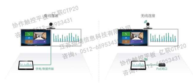 可采用Wi-Fi網(wǎng)絡與視頻會議主機完成連接,并通過POE供電,免去電視區(qū)域與會議桌的布線困擾,輕松打造無線會議體驗