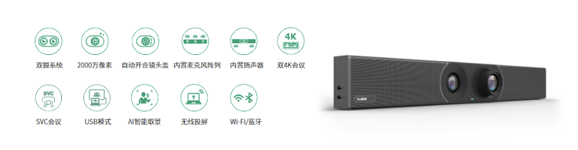 兼顧會(huì)議室全景與細(xì)節(jié)呈現(xiàn);支持雙 4K 超清視頻通話和內(nèi)容分享,更集成人臉檢測(cè)、聲源定位、語(yǔ)音追蹤等多項(xiàng)AI 技術(shù),搭配全自動(dòng)開(kāi)合鏡頭隱私蓋,保障日常會(huì)議信息安全,提供更智能更安全的會(huì)議體驗(yàn)。 MeetingEye 600 采用一體化設(shè)計(jì),集成視頻編解碼器 / 雙攝像機(jī) / 麥克風(fēng) / 揚(yáng)聲器 /Wi-Fi/ 藍(lán)牙,支持多種無(wú)線投屏技術(shù),無(wú)線化部署,快速便捷分享,化繁為簡(jiǎn),是中型會(huì)議室的理想之選。同時(shí),可作為 PC 的音視頻外設(shè)使用,實(shí)現(xiàn)與各類云平臺(tái)的互通。